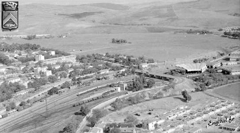 Arrivée en gare après le château d'eau à gauche, au loin les ateliers du CFA en 1952.
